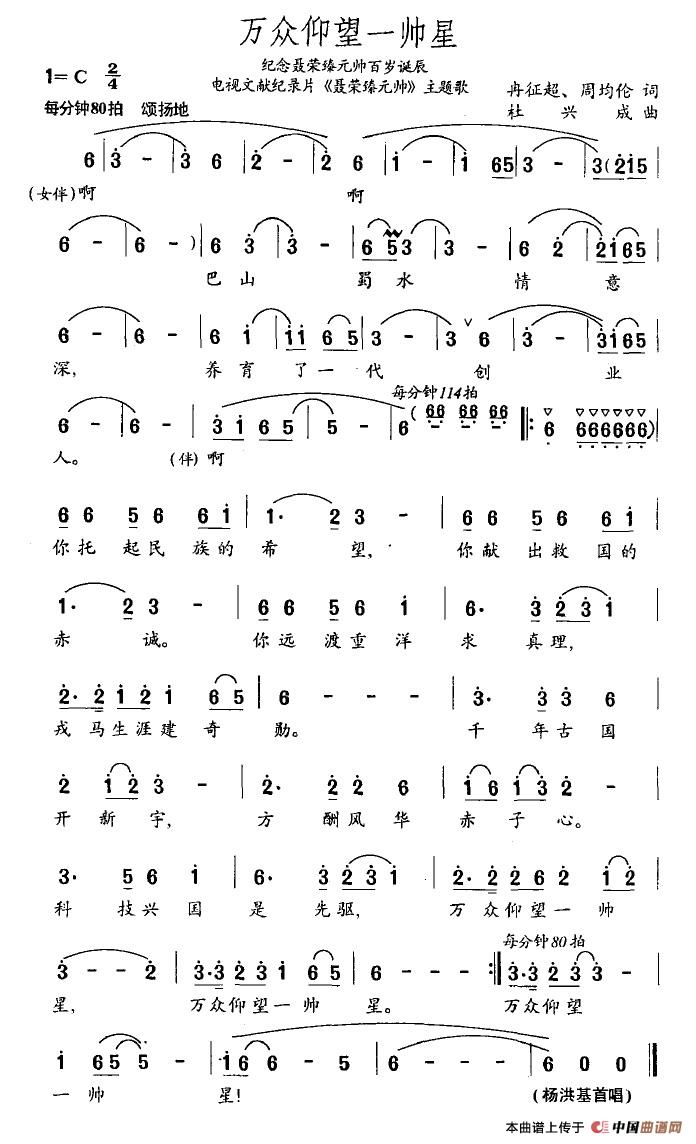 曲谱:万众仰望一帅星(电视文献纪录片《聂荣臻元帅》主题歌)