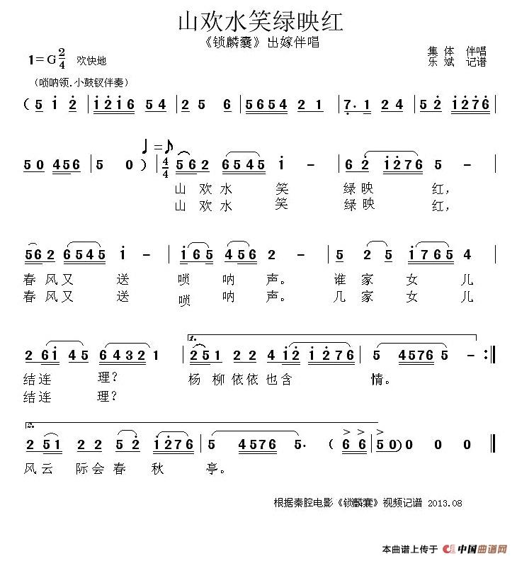 曲谱:[秦腔] 山欢水笑绿映红(《锁麟囊》出嫁伴唱唱段)