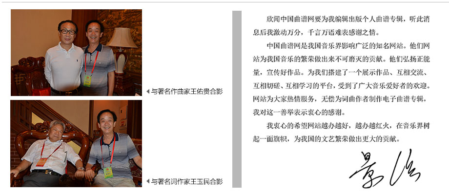 《中国曲谱网》衷心感谢景治老师对谱站的大力支持!特地编撰出版个人创作歌曲专辑,分享他的成就,分享他的快乐,分享他的艺术才华!我们也预祝景治老师永葆艺术青春,创作更多更好的歌曲作品,唱响时代歌声!