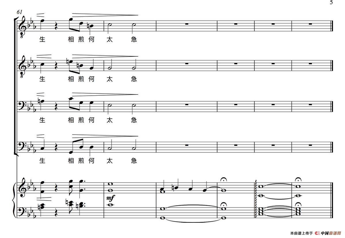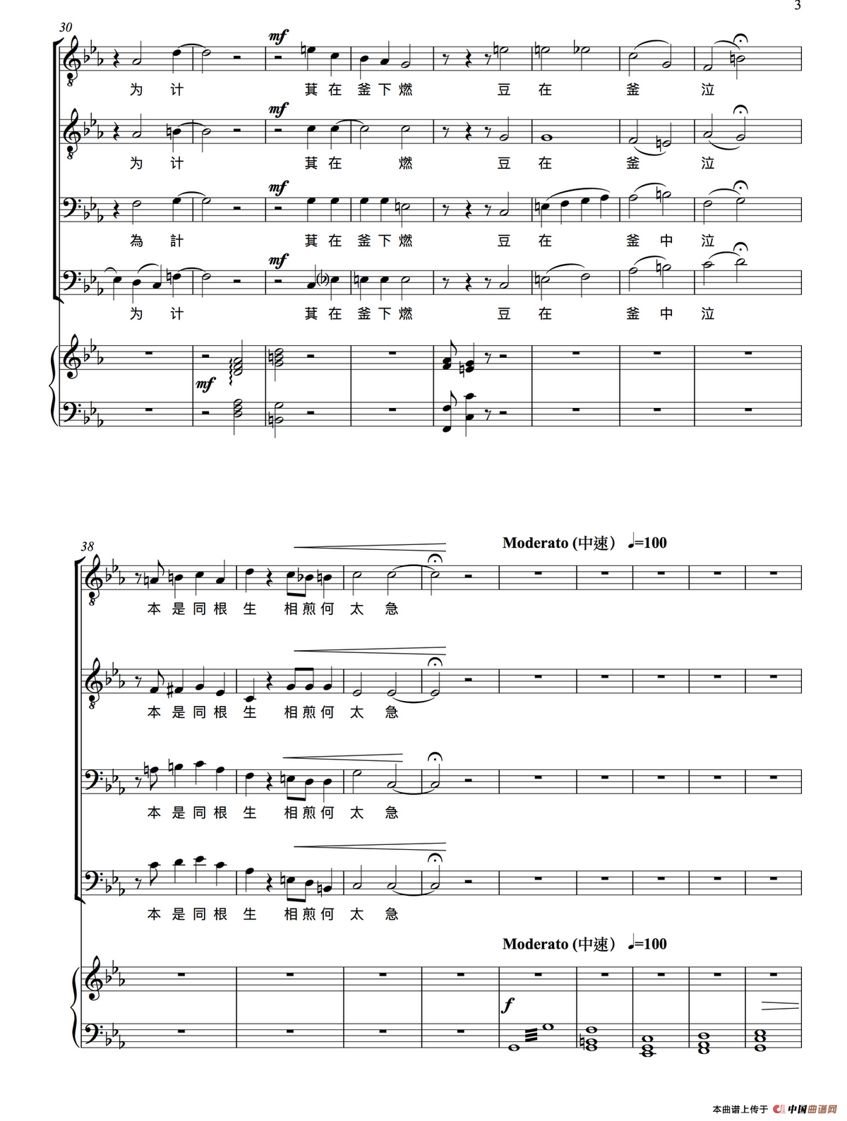此曲的诗词由三国的魏国的诗人曹植所写。曲式是以 ABA所谱。本作品是以男声四部合唱为主,共为3段。先是合唱,然后逐渐进入,最后再次合唱的方式来演奏。