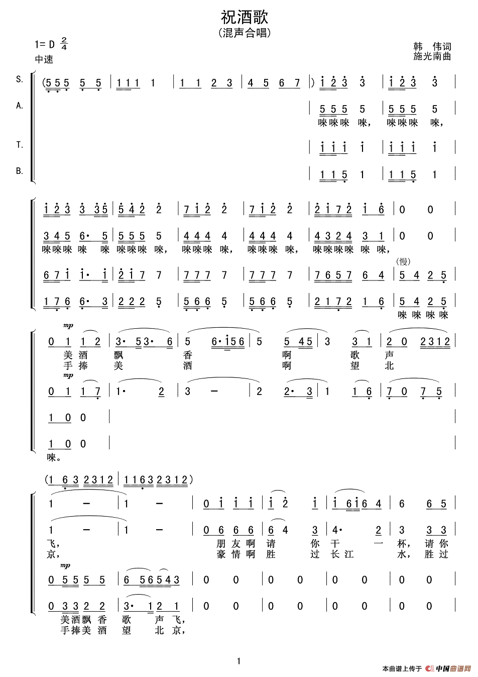 提示:在曲谱图片上单击右键,选择“图片另存为...”即可将曲谱保存到您的电脑中,打印时候可将图片插入到WORD中,调整合适大小打印即可。