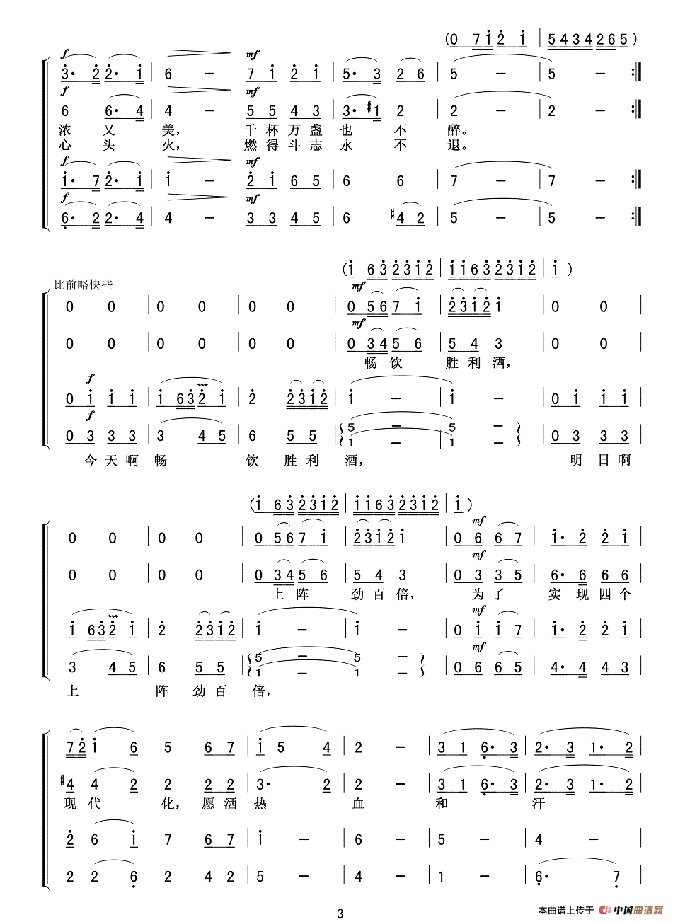 今天啊畅饮胜利酒,明日啊上阵劲百倍,为了实现四个现代化,愿洒热血和汗水。
