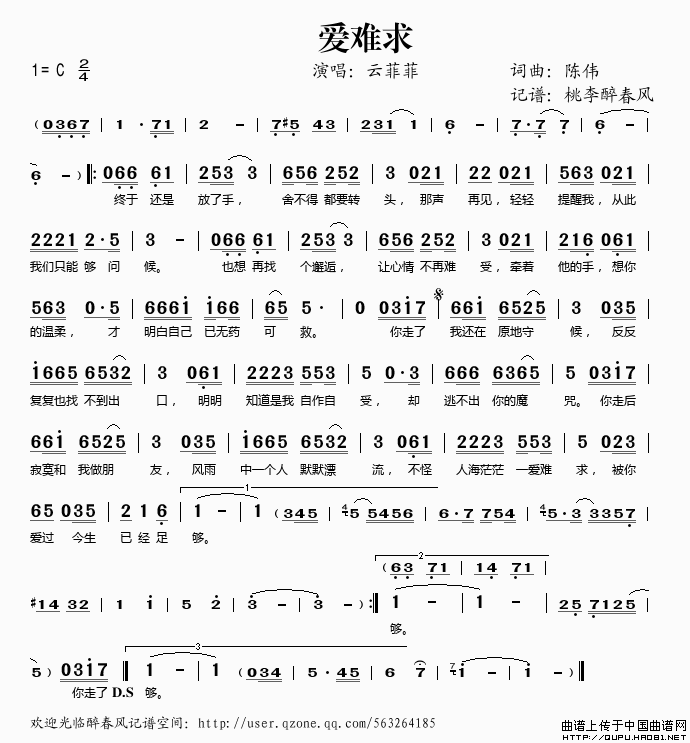 作词:陈伟   作曲:陈伟   演唱(奏):云菲菲   格式:简谱   来源:桃李醉春风 记谱上传   上传:桃李醉春风   日期:2011-09-27   浏览次数: