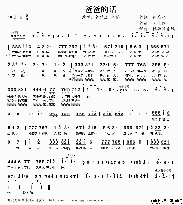 作词:何启弘   作曲:陶大伟   演唱(奏):钟镇涛、钟懿   格式:简谱   来源:桃李醉春风 记谱上传   上传:桃李醉春风   日期:2012-05-31   浏览次数: