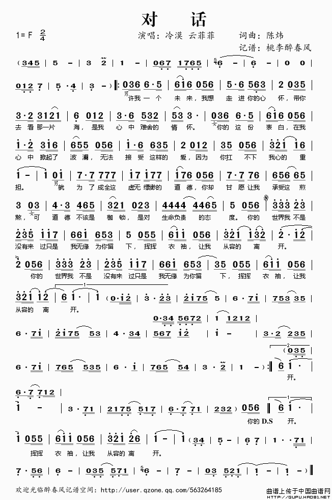 作词:陈炜   作曲:陈炜   演唱(奏):冷漠、云菲菲   格式:简谱   来源:桃李醉春风 记谱上传   上传:桃李醉春风   日期:2011-01-13   浏览次数: