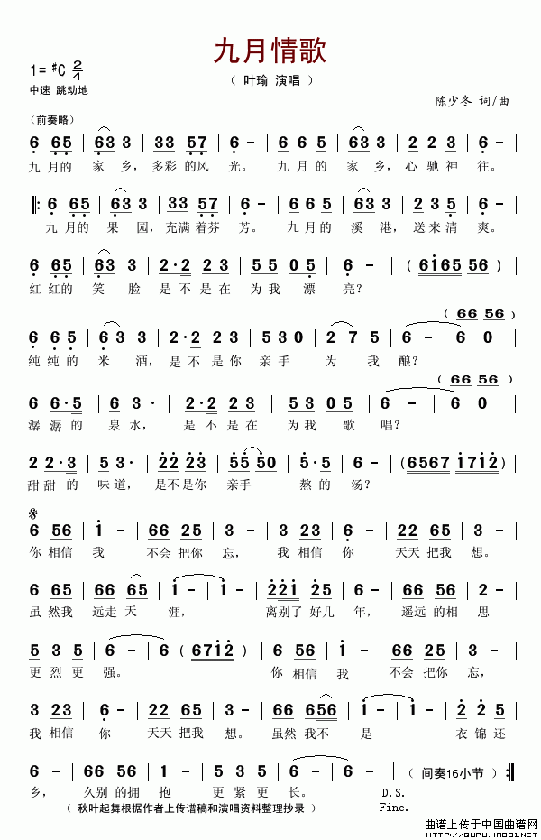 关于《九月情歌》曲谱的评论