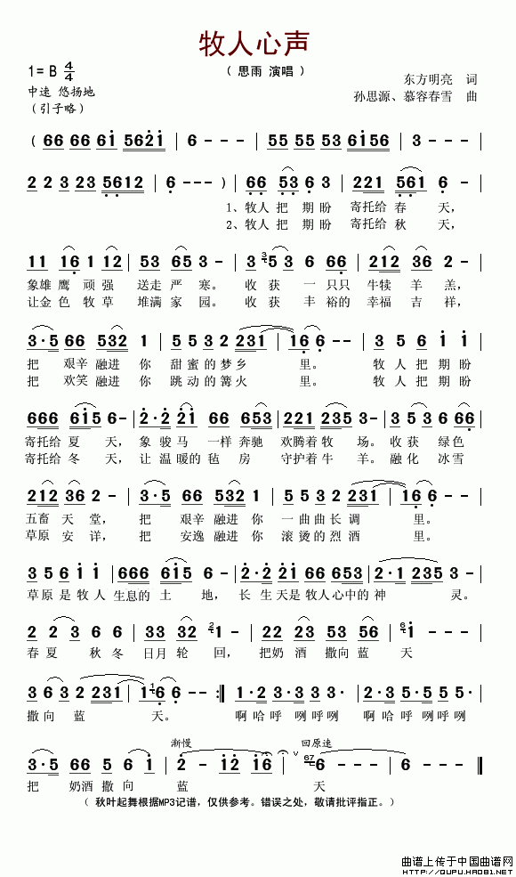 这首歌曲吸引了不少的网络歌手演唱,但是每位歌手的演唱都不尽相同。我采用了思雨(草原歌声)的演唱记录简谱并给出了试听地址。