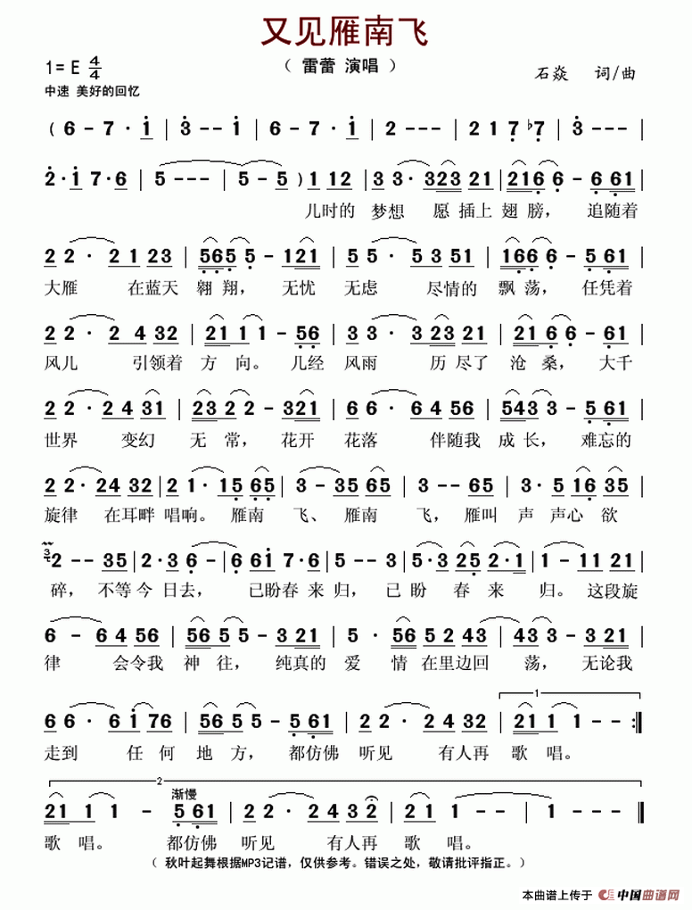 关于《又见雁南飞》曲谱的评论