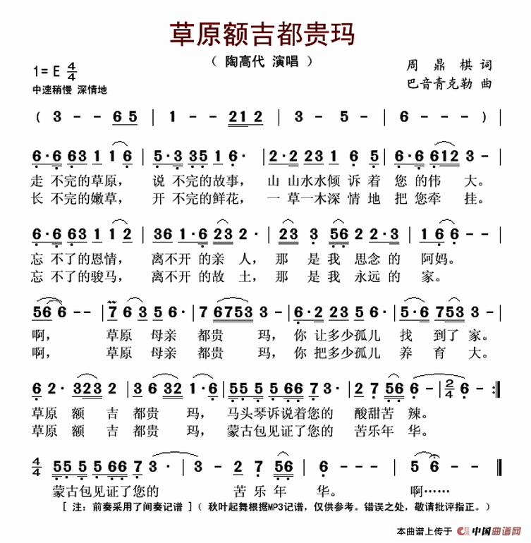 关于《草原额吉都贵玛》曲谱的评论