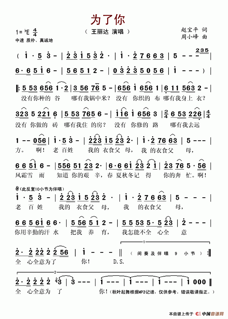 为积极配合当前正在开展的党的群众路线教育实践活动,由著名词作家赵宝平女士、著名曲作家周小峰先生共同创作的原创歌曲“为了你”,该歌旋律流畅,朗朗上口,易于传唱,歌词平白如话且寓意深刻,是一首充满正能量的大爱颂歌,该作品充分反映了党和人民群众的血肉关系,对于强化广大党员干部的宗旨意识和群众观点,着力解决党员、干部作风问题,增强党的创造力凝聚力战斗力将起到了积极的推动作用。