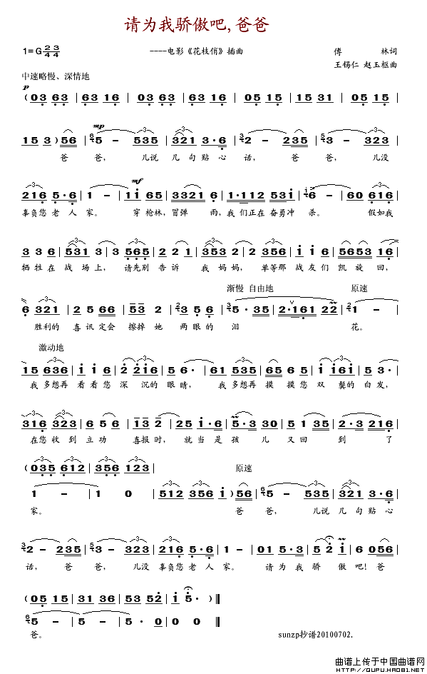 作词:傅林   作曲:王锡仁、赵玉枢   演唱(奏):李双江   格式:简谱   来源:sunzp抄谱   上传:sunzp   日期:2010-07-03   浏览次数: