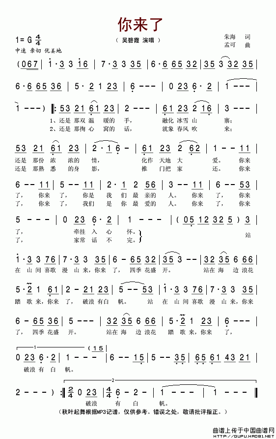 关于《你来了》曲谱的评论