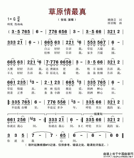 作词:姚晓芸 作曲:邰景鲲 演唱(奏):张铭 格式:简谱 来源:秋叶起舞 记谱上传 上传:秋叶起舞