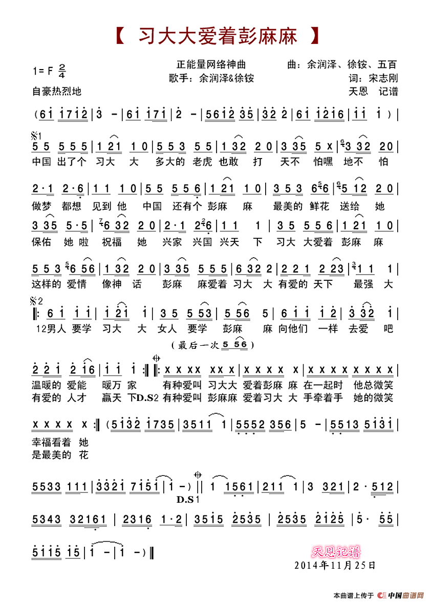 《习大大爱着彭麻麻》文本歌词
