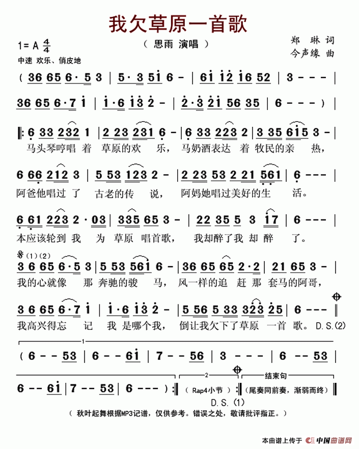 关于《我欠草原一首歌》曲谱的评论
