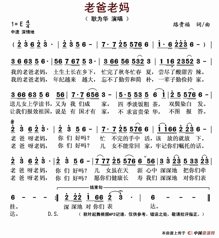 老爸呀老妈,你们好吗?愿你们健康长寿我们深深地对你们表达。