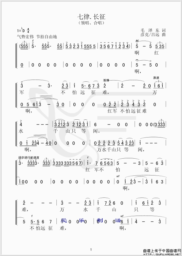 作词:毛泽东   作曲:彦克、吕远   格式:简谱   来源:爱乐 制谱上传   上传:爱乐   日期:2010-03-12   浏览次数: