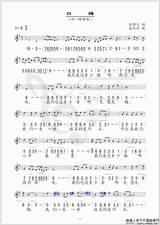 口碑(线、简谱混排版---石顺义词 孟庆云曲)