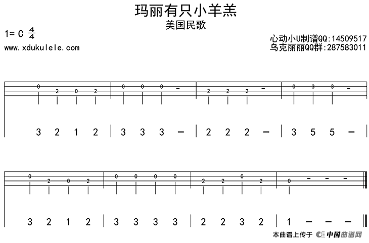 玛丽有只小羊羔(单音练习)(ukulele四线谱)