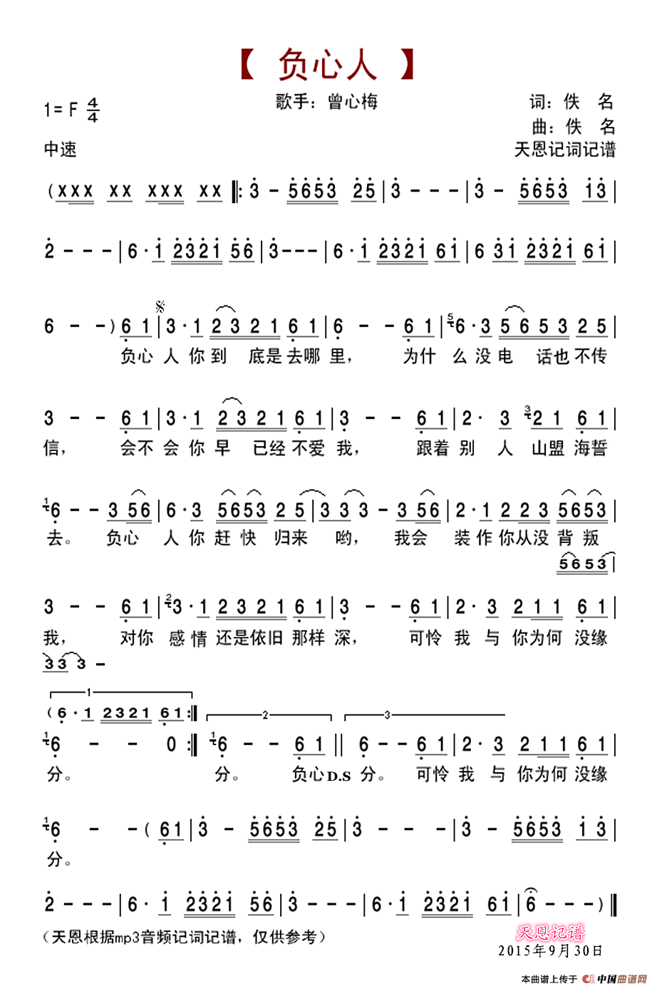 《负心人》文本歌词