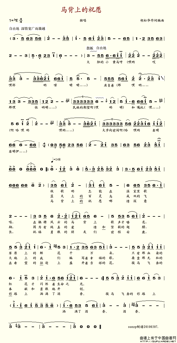 作词:胡松华   作曲:胡松华   演唱(奏):胡松华   格式:简谱   来源:乐友sunzp 制谱上传|   上传:sunzp   日期:2010-03-14   浏览次数: