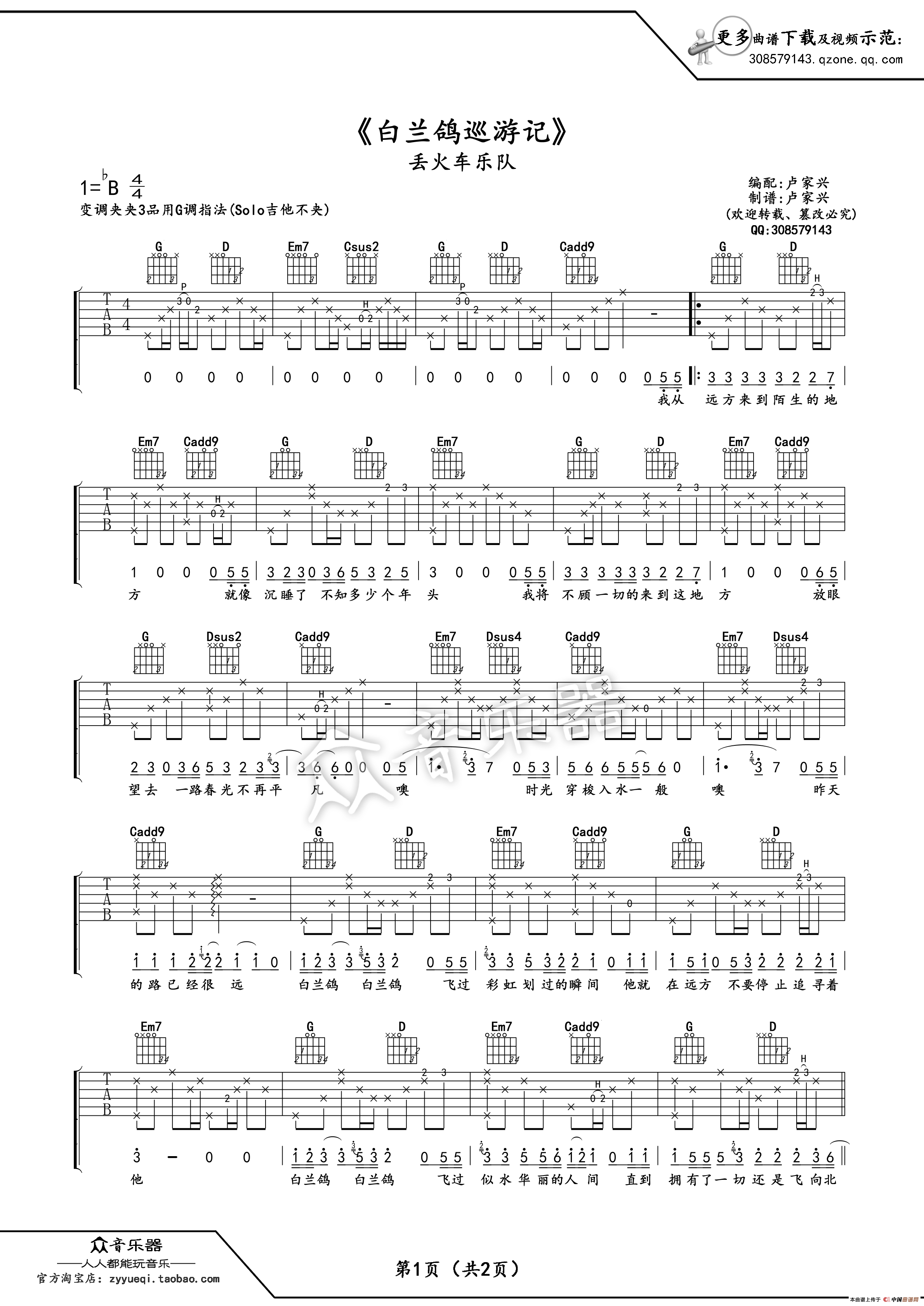 白兰鸽巡游记 (吉他谱 六线谱、卢家兴编配)
