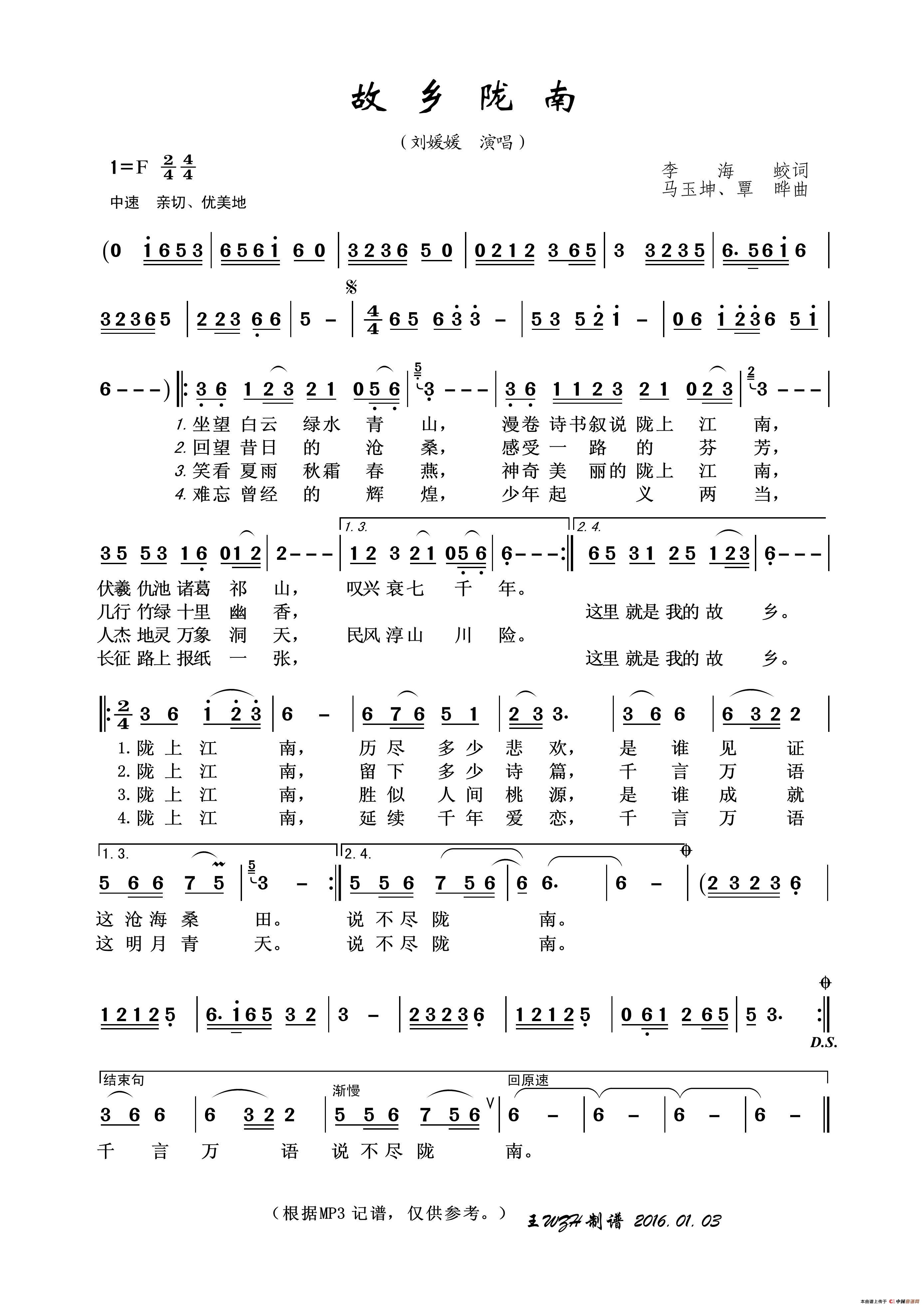 关于《故乡陇南》曲谱的评论