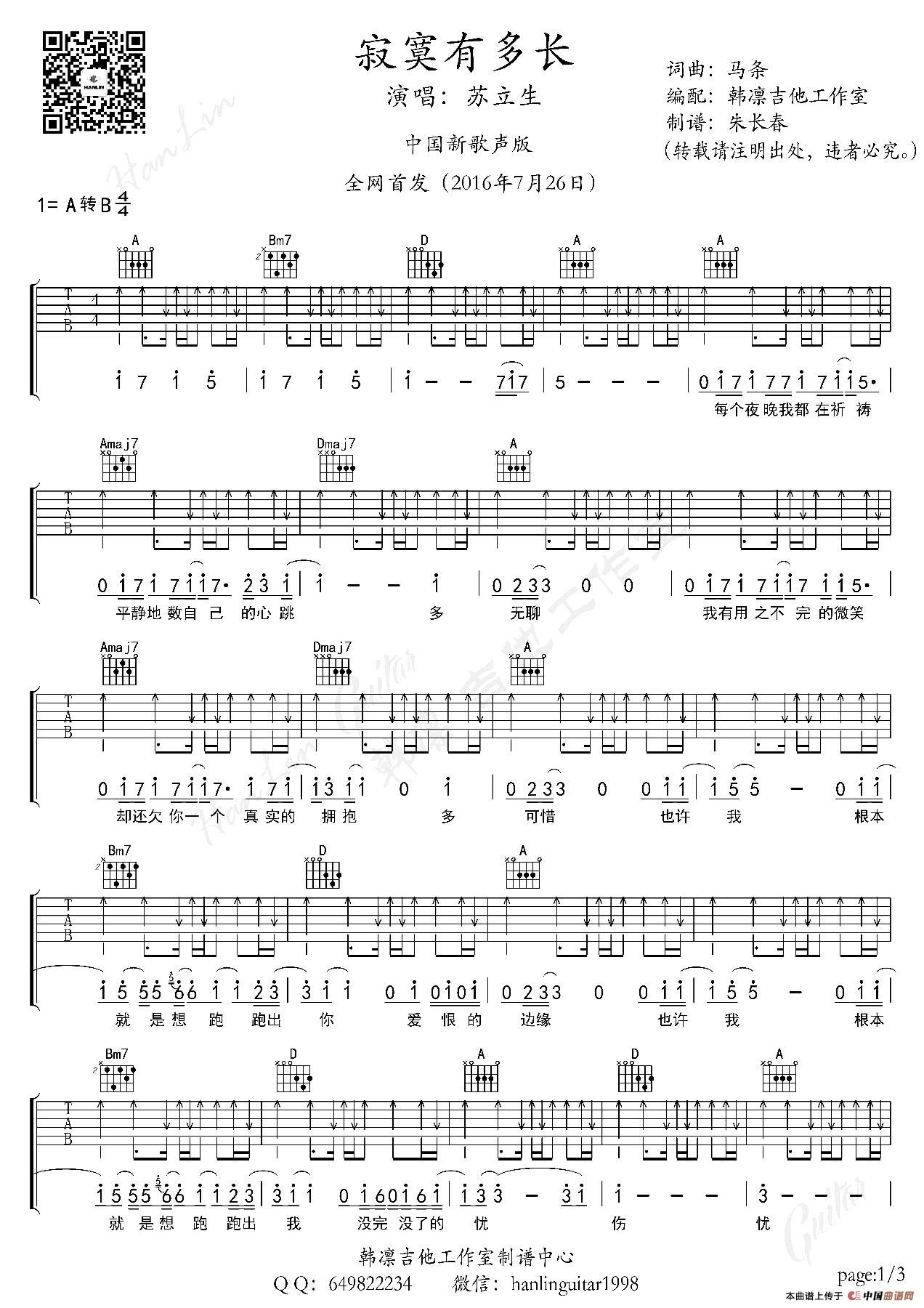 《寂寞有多长》词曲:马条,原唱;马条,中国新歌声选手:苏立生翻唱,此版本是:中国新歌声版本,韩凛吉他工作室,原版编配,转载请注明出处,支持一下我们制谱扒谱的工作,2016.7.26全网首发,求谱:Q:649822234,微信:hanlinguitar1998