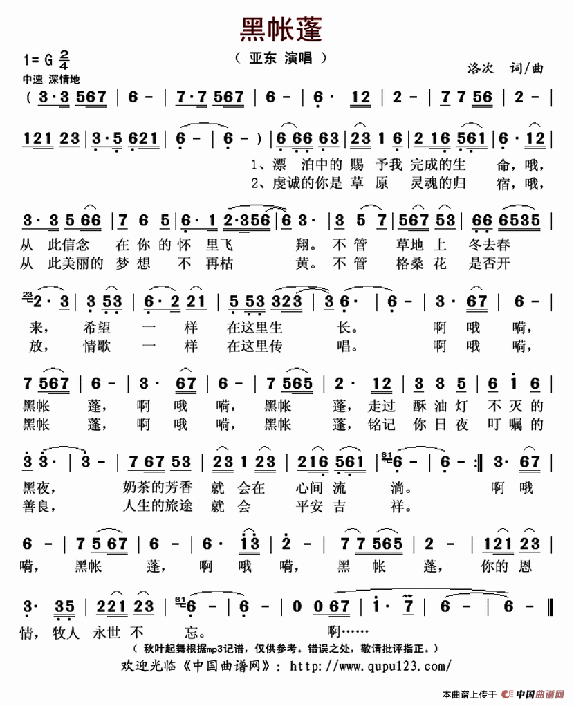 关于《黑帐篷》曲谱的评论