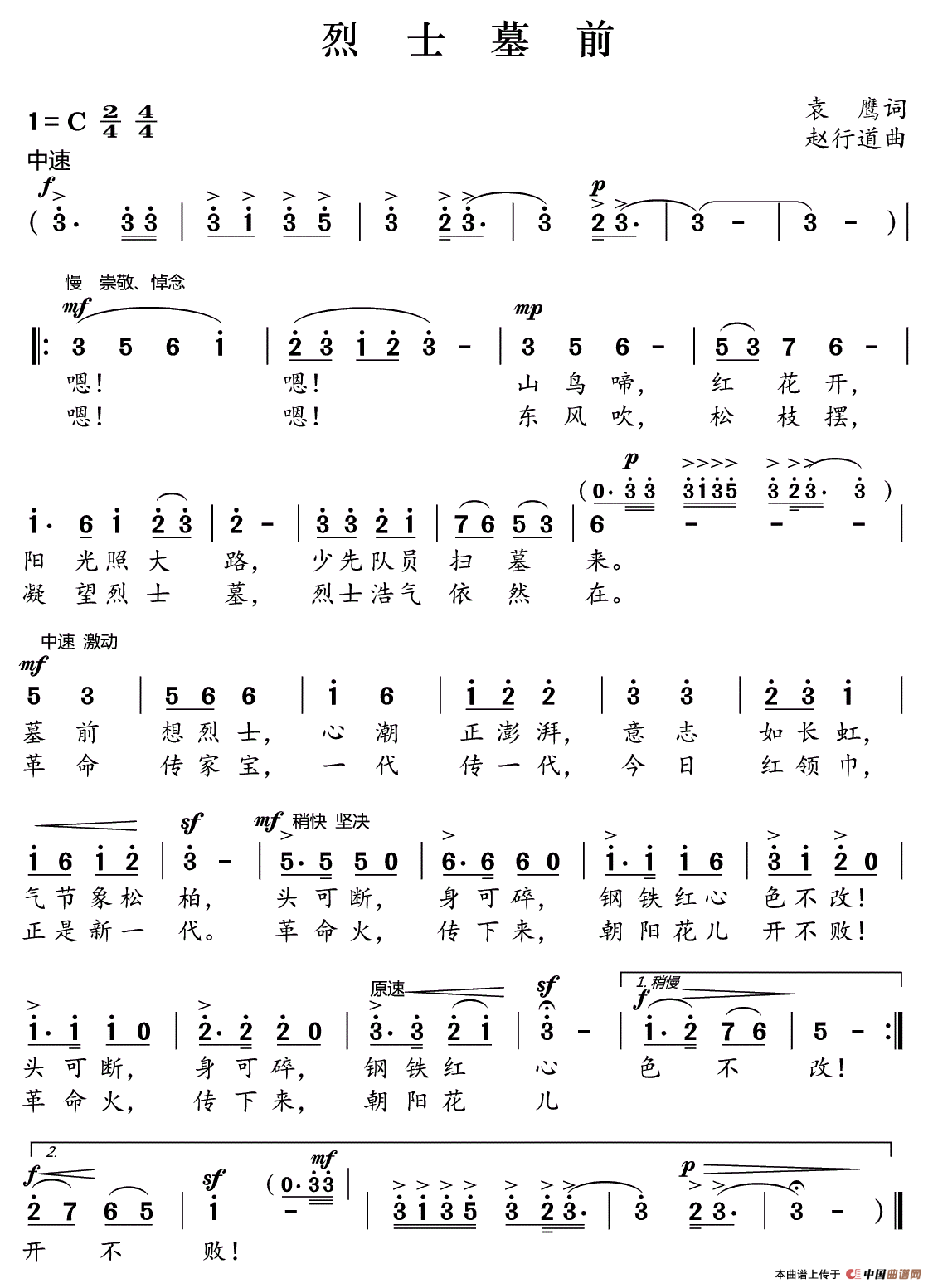 山鸟啼,红花开,阳光照大路,少先队员扫墓来。