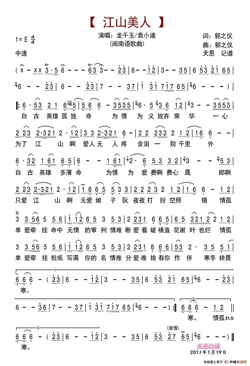 提示:在曲谱图片上单击右键,选择"图片另存为..."即可将曲谱保存到您的电脑中,打印时候可将图片插入到WORD中,调整合适大小打印即可。