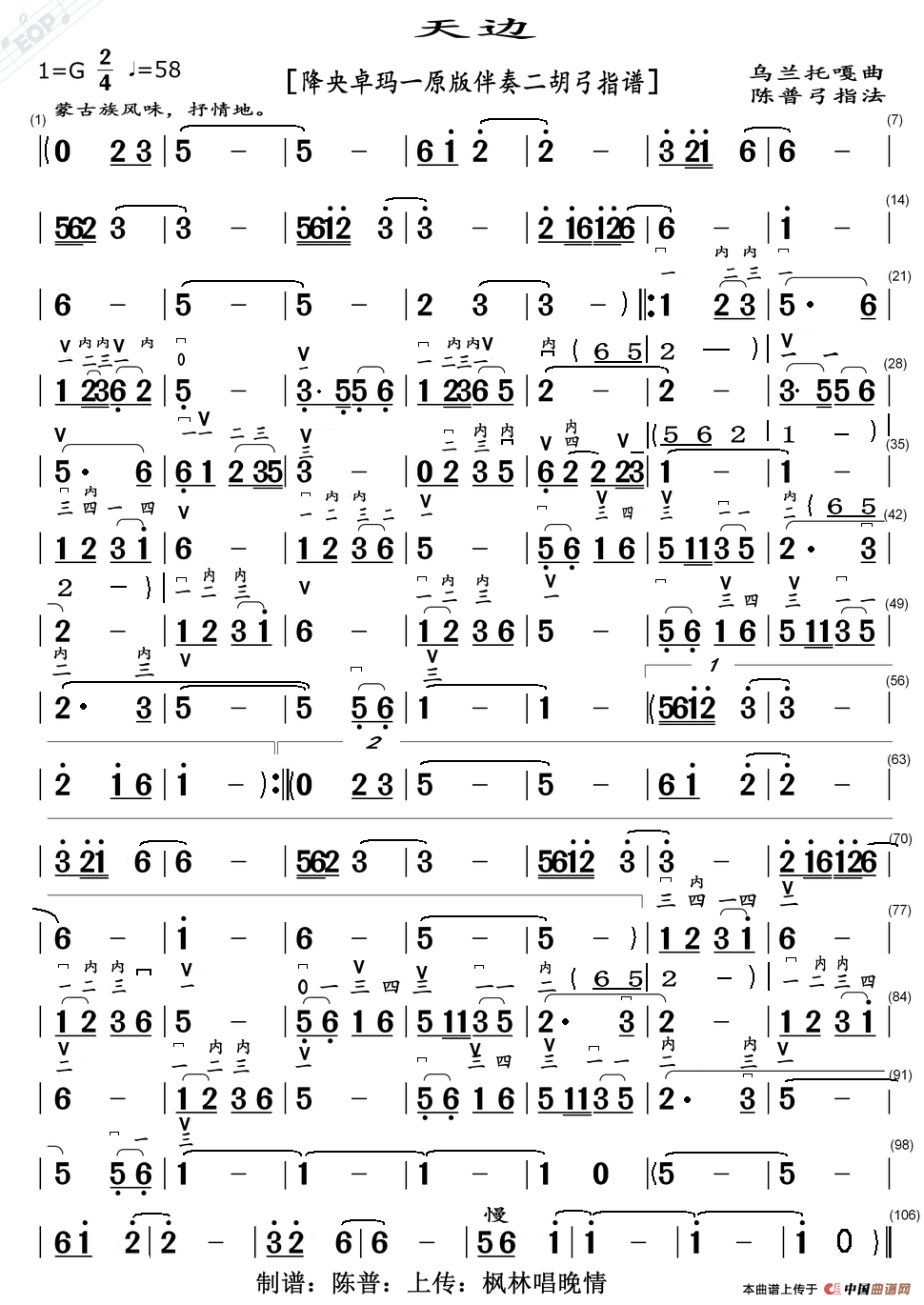 天边(降央卓玛一原版伴奏二胡弓指谱)