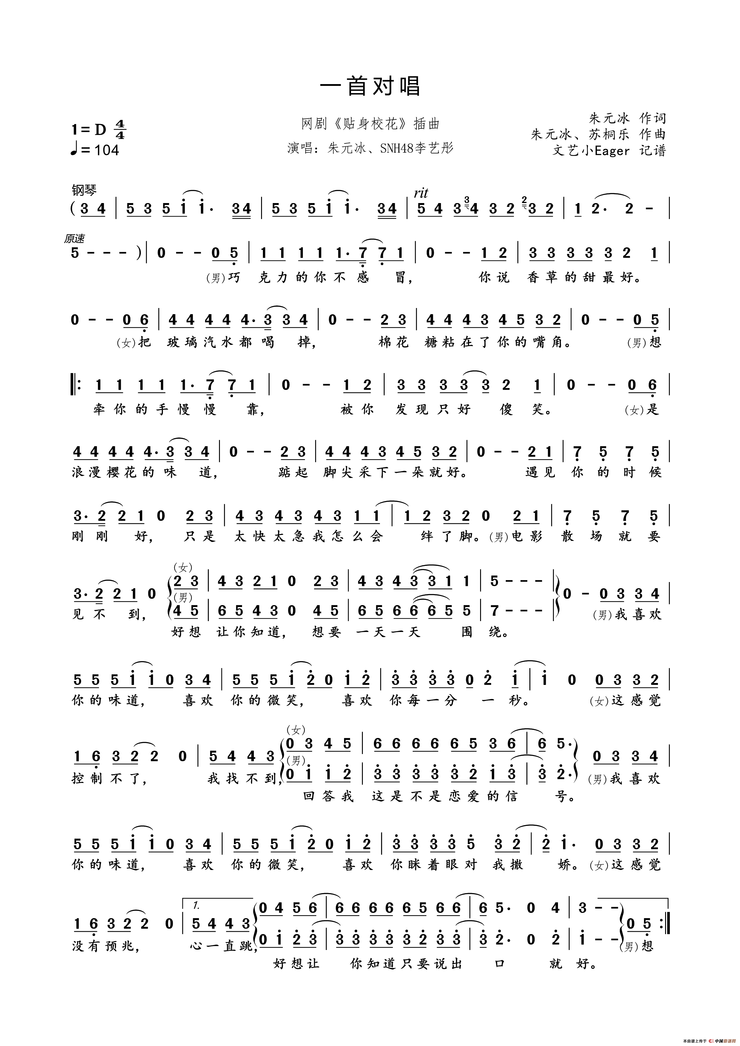 《一首对唱》文本歌词