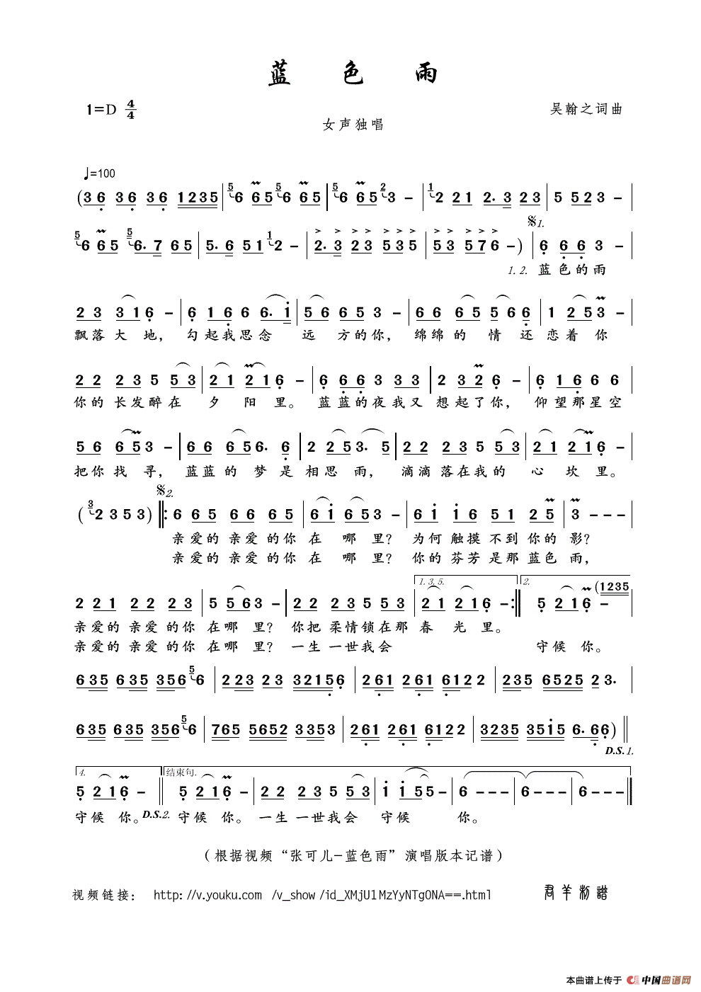 关于《蓝色雨》曲谱的评论