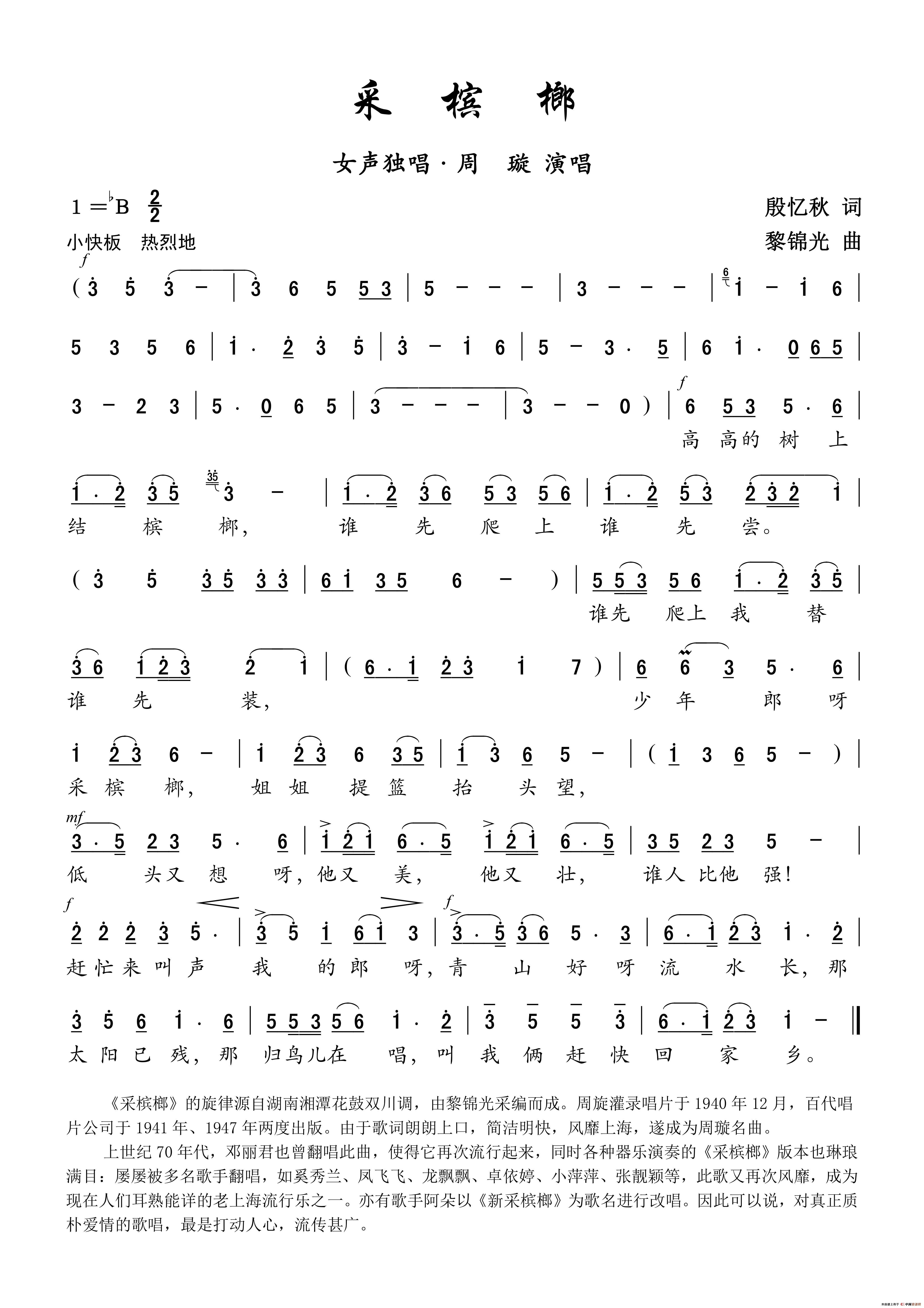 《采槟榔》的旋律源自湖南湘潭花鼓双川调,由黎锦光采编而成。周旋灌录唱片于1940年12月,百代唱片公司于1941年、1947年两度出版。由于歌词朗朗上口,简洁明快,风靡上海,遂成为周璇名曲。