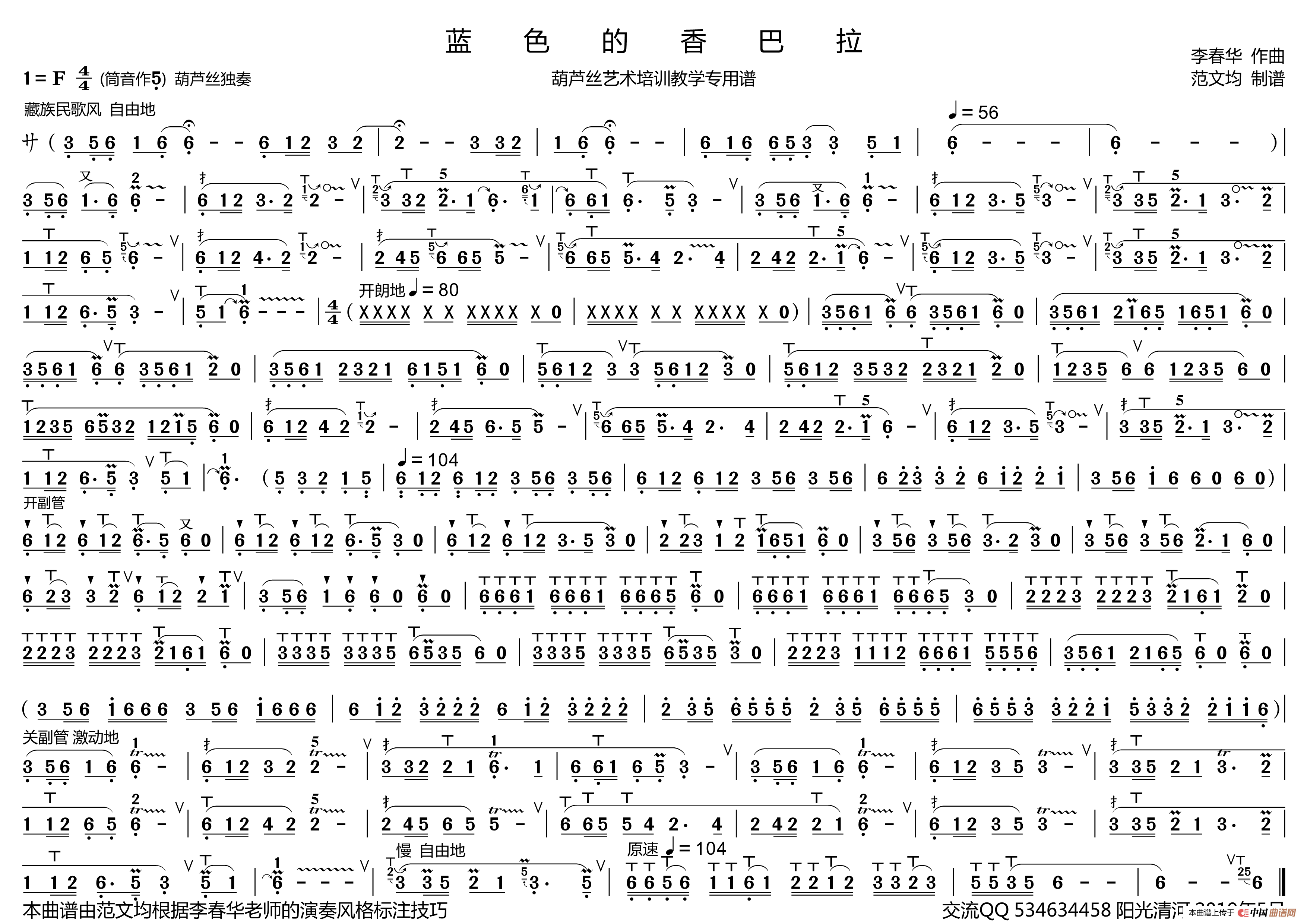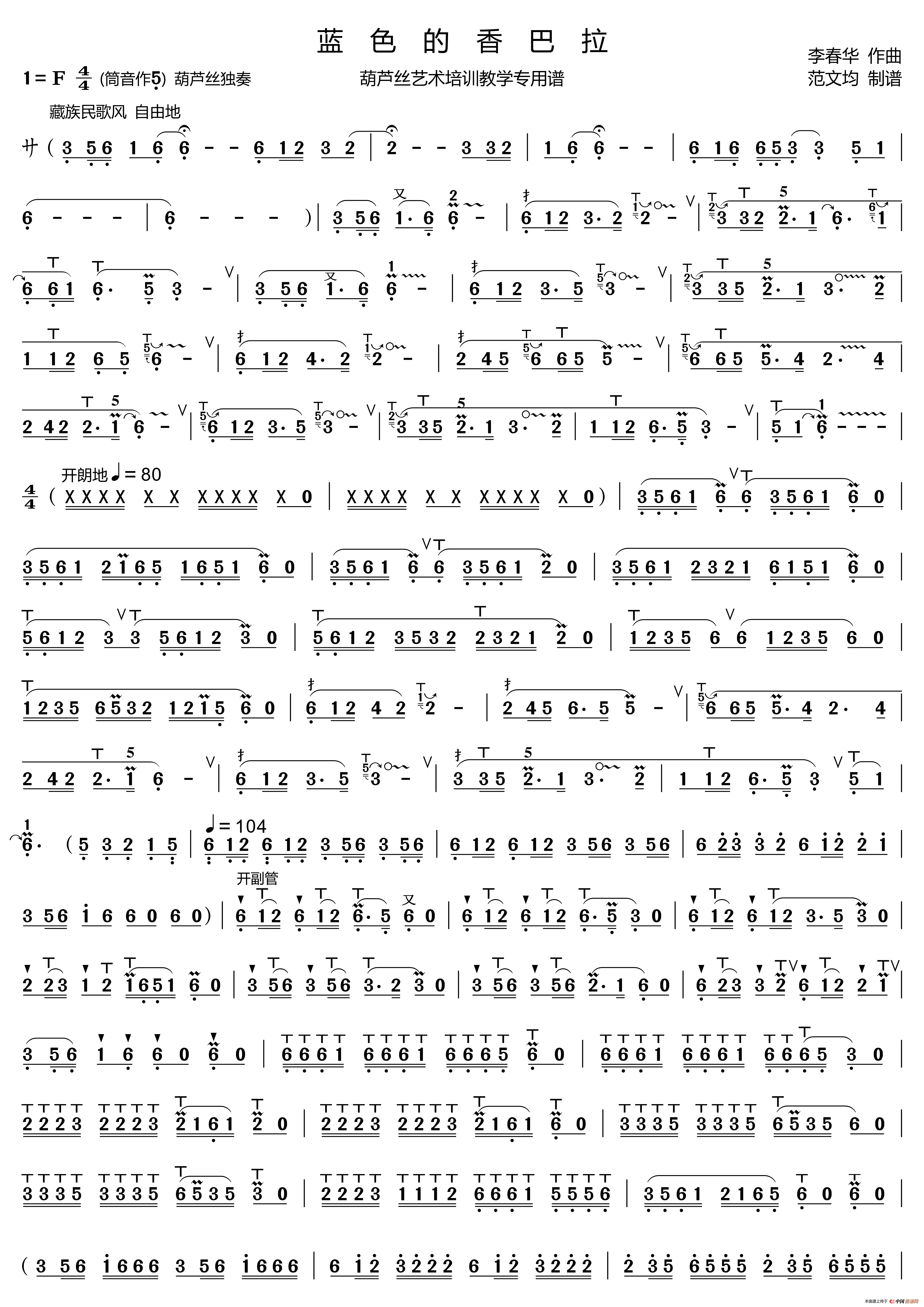 蓝色的香巴拉简谱(葫芦丝谱 李春华版)