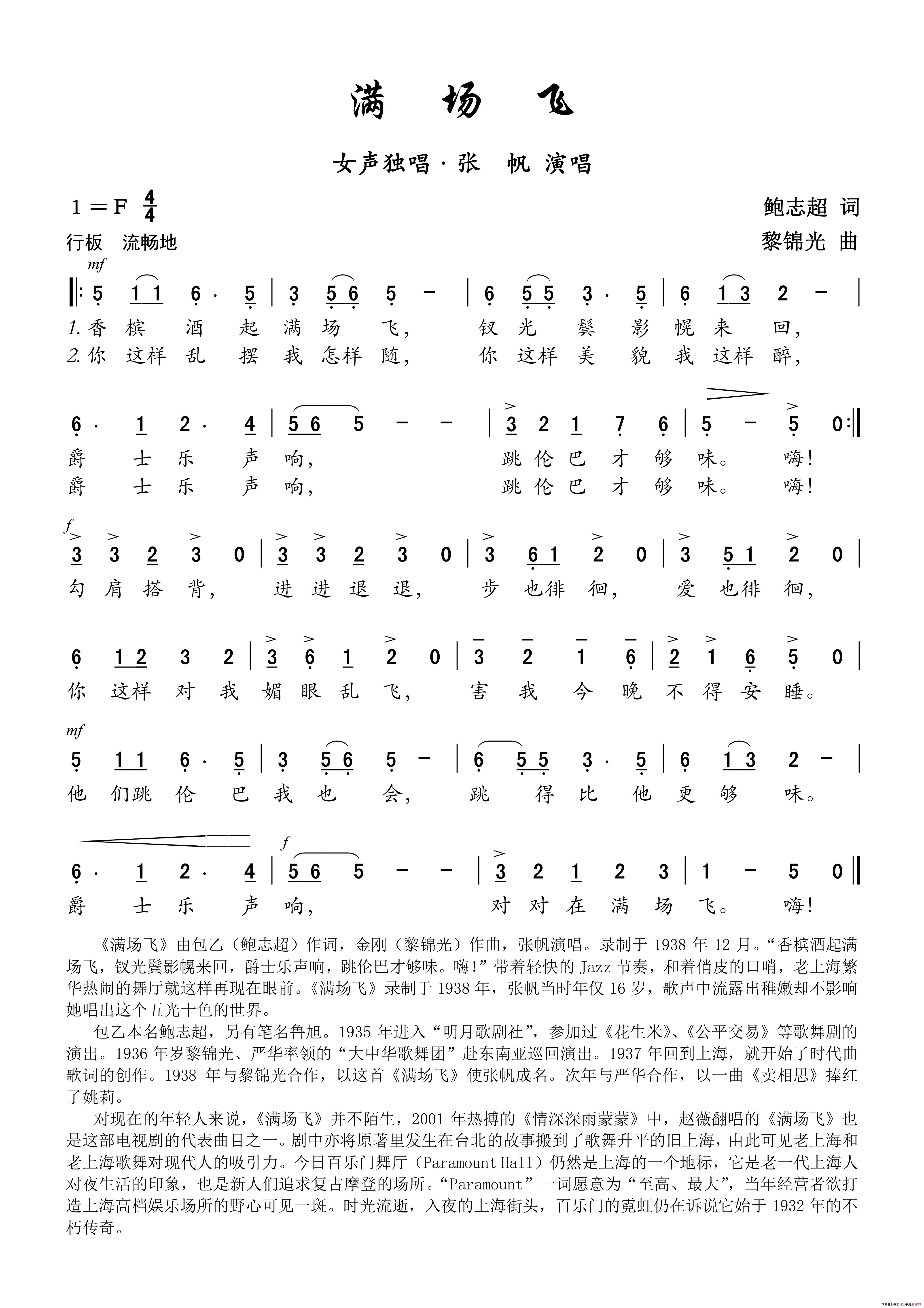 《满场飞》由包乙(鲍志超)作词,金刚(黎锦光)作曲,张帆演唱。录制于1938年12月。“香槟酒起满场飞,钗光鬓影幌来回,爵士乐声响,跳伦巴才够味。嗨!”带着轻快的Jazz节奏,和着俏皮的口哨,老上海繁华热闹的舞厅就这样再现在眼前。《满场飞》录制于1938年,张帆当时年仅16岁,歌声中流露出稚嫩却不影响她唱出这个五光十色的世界。