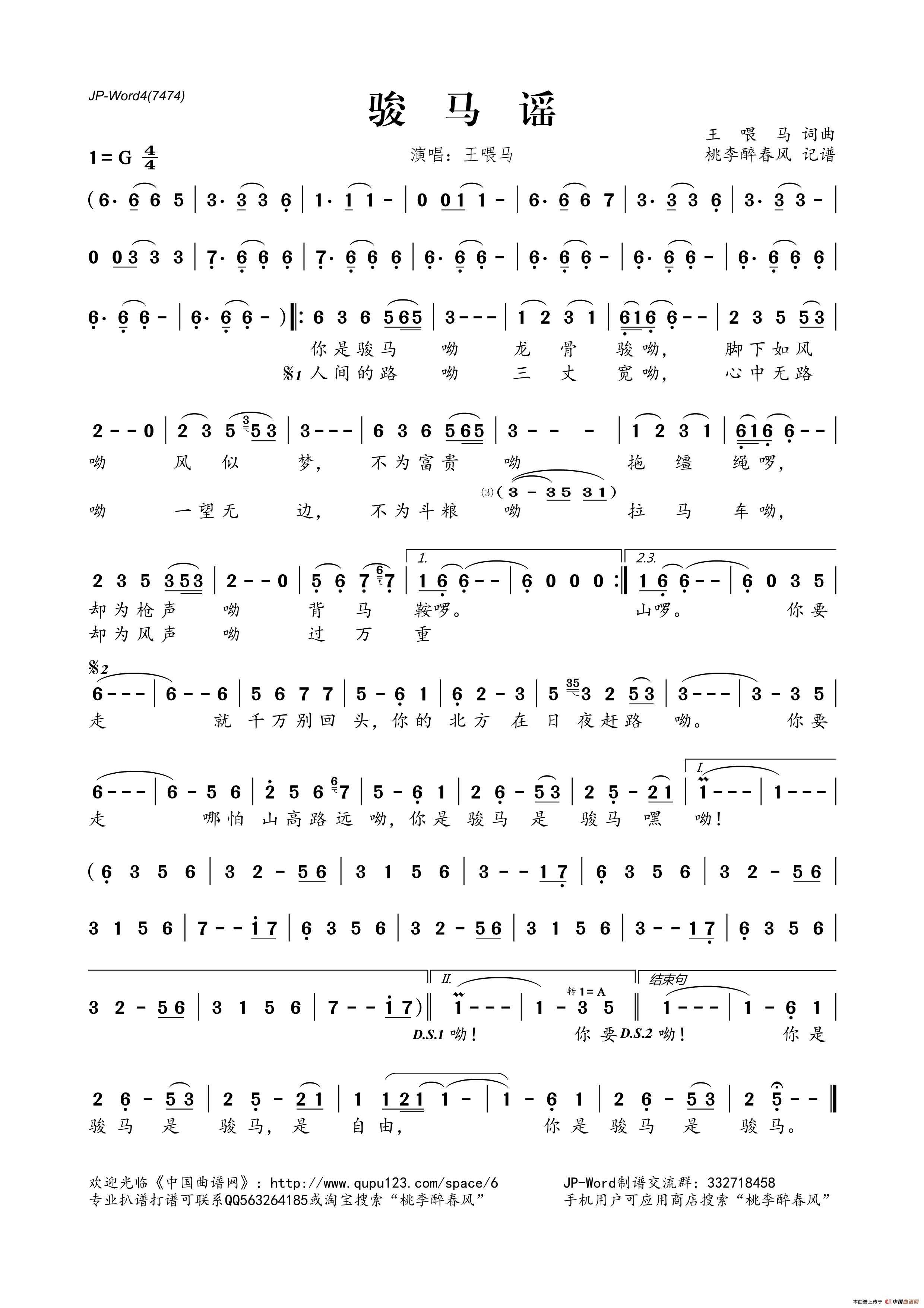 作词:王喂马 作曲:王喂马 演唱(奏):王喂马 来源:桃李醉春风记谱 上传:桃李醉春风