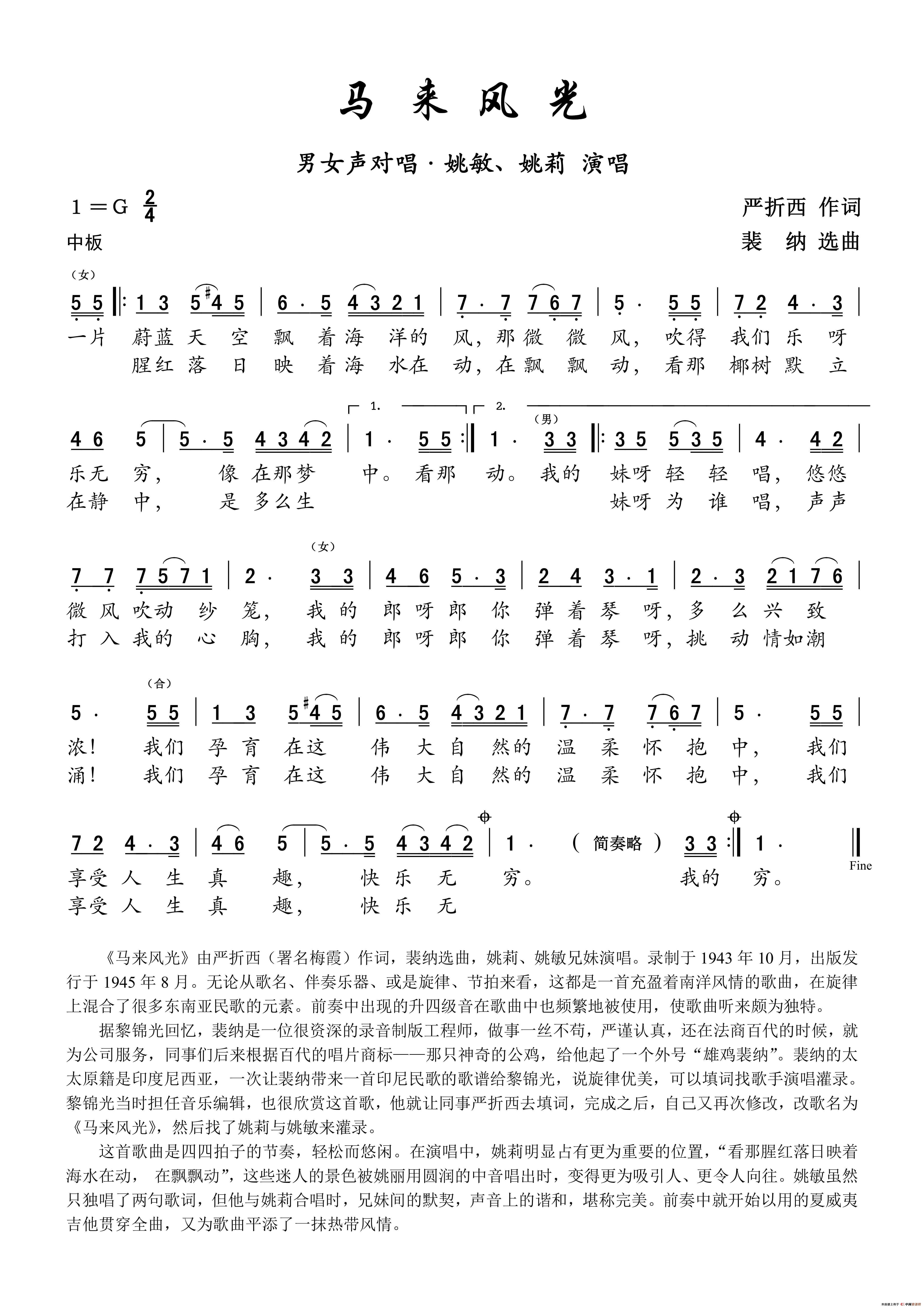 歌曲《马来风光》(男女声对唱)文字介绍文本——