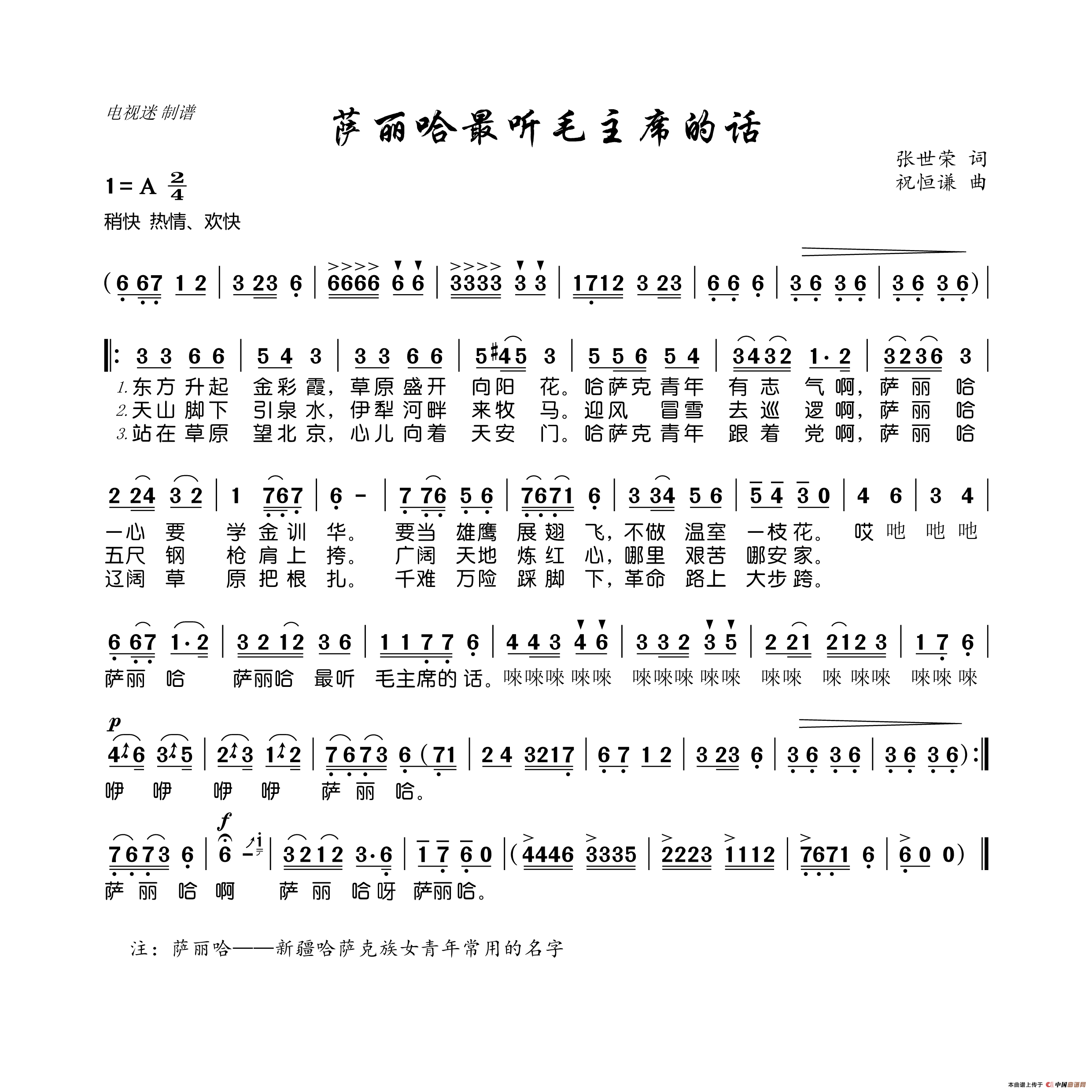关于《萨丽哈最听毛主席的话》曲谱的评论