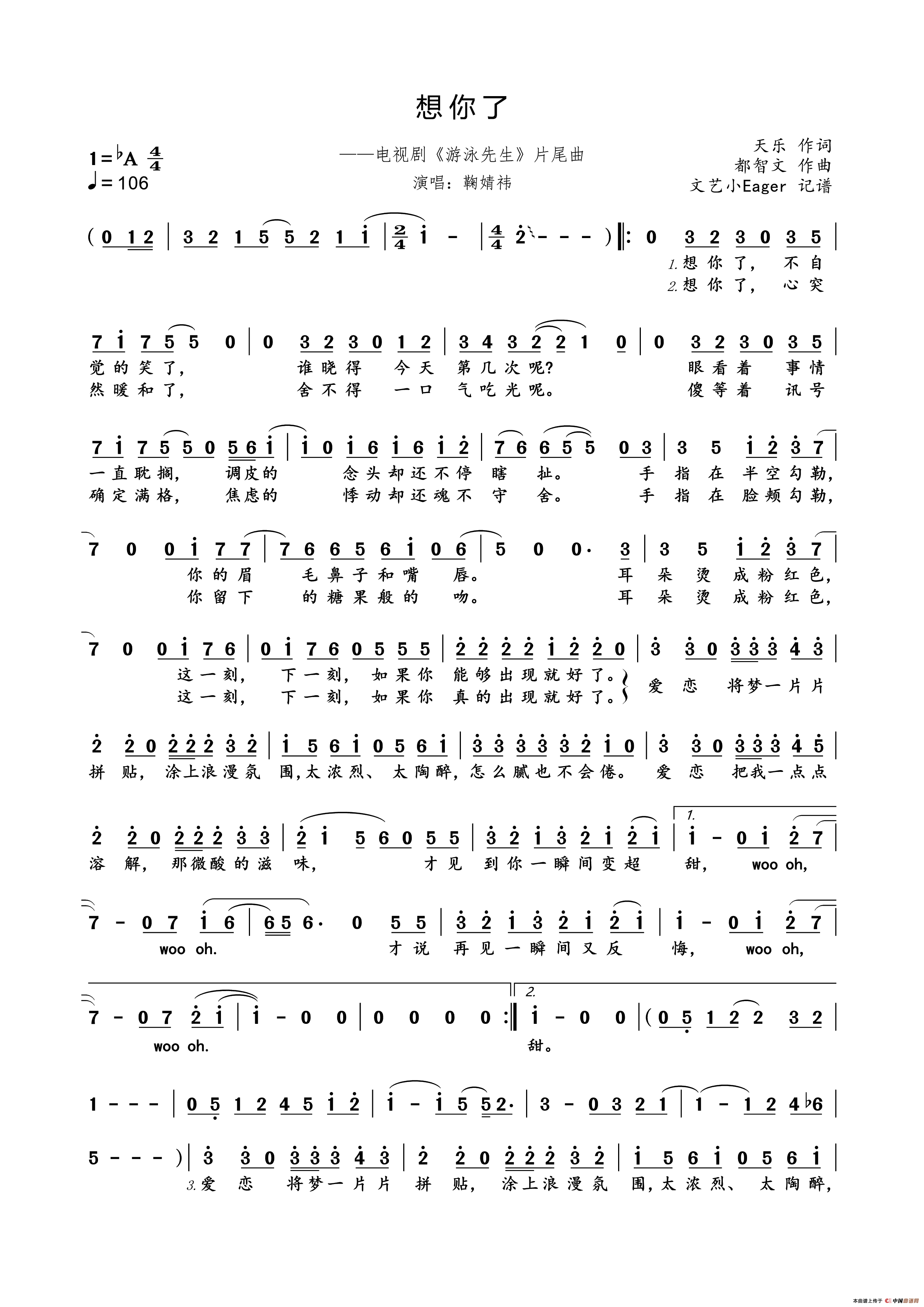 本曲谱是电视剧《游泳先生》的片尾曲,这首歌由天乐作词,都智文作曲,鞠婧祎演唱,收录于专辑《等不到你》中,发行于2017年06月19日。