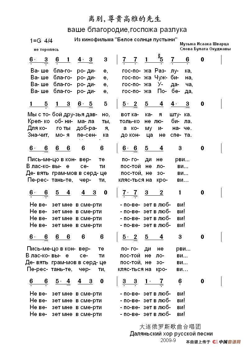 离别尊贵高雅的先生ваше благородиегоспожа разлука(中俄简谱)