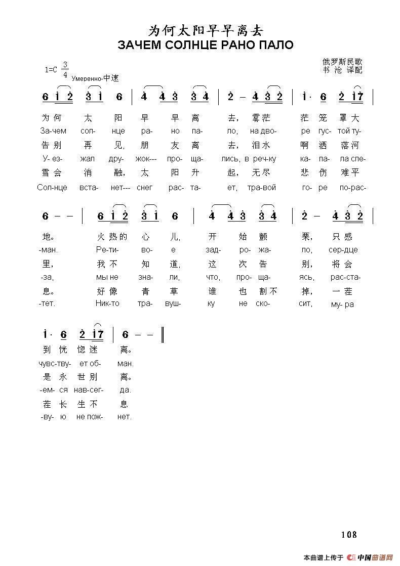 为何太阳早早离去ЗАЧЕМ СОЛНЦЕ РАНО ПАЛО(中俄简谱)