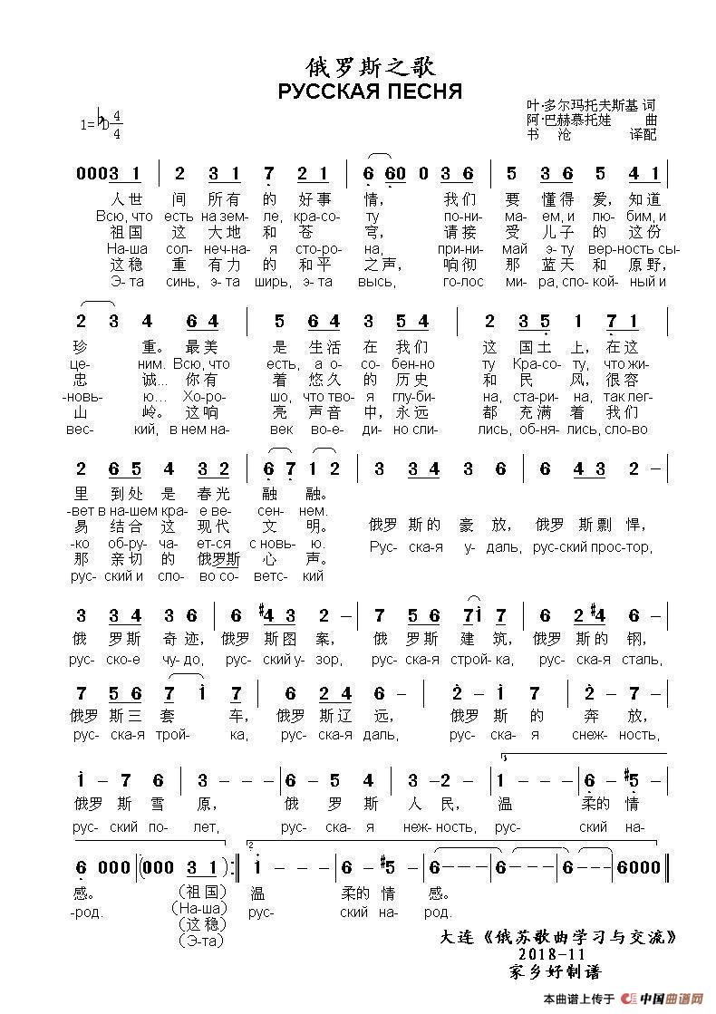 俄罗斯之歌РУССКАЯ ПЕСНЯ(中俄简谱)