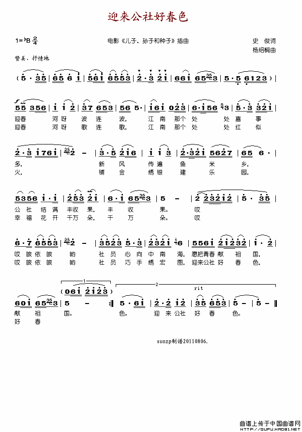 作词:史俊   作曲:杨绍榈   演唱(奏):朱逢博   格式:简谱   来源:sunzp制谱   上传:sunzp   日期:2011-08-18   浏览次数: