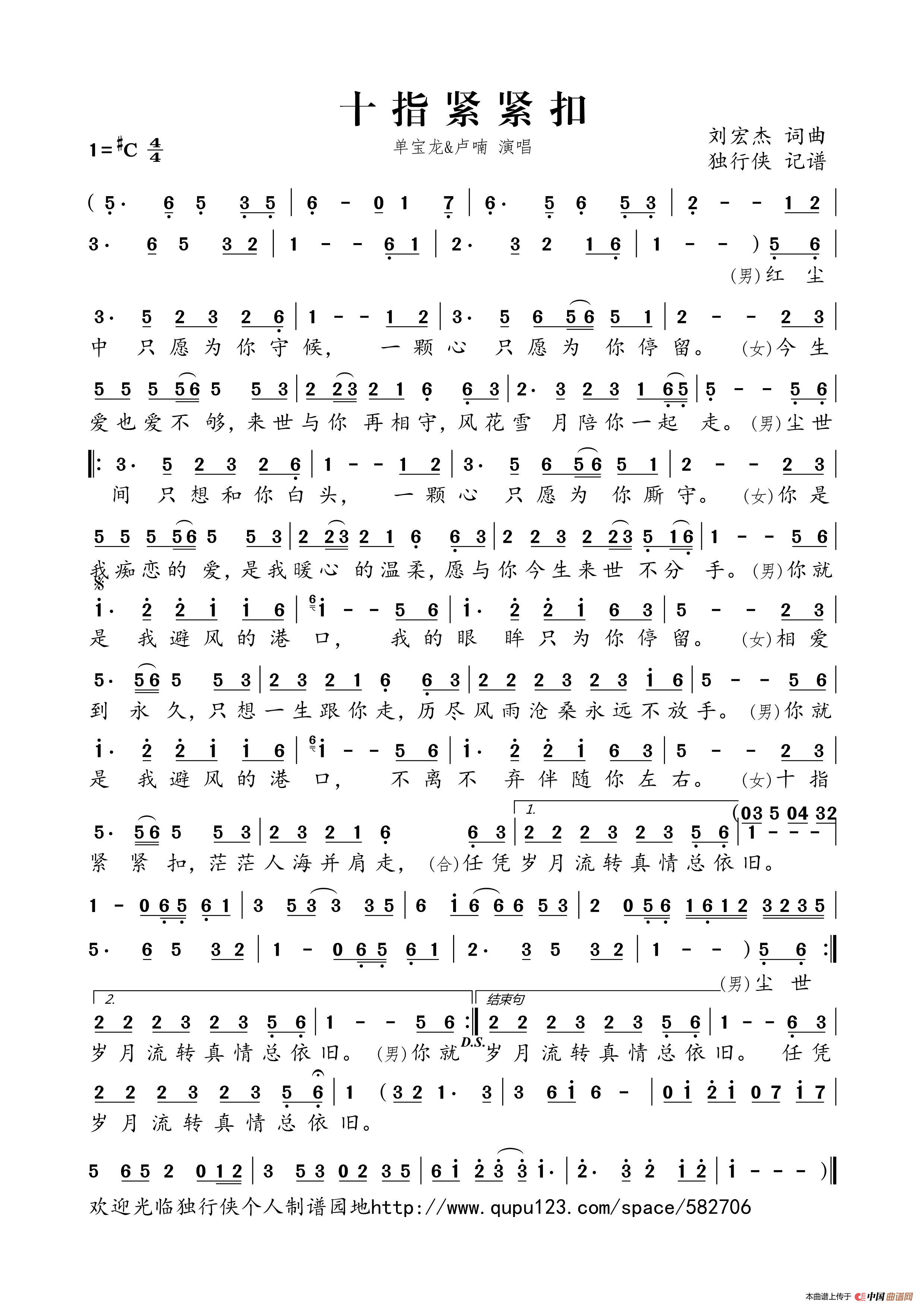 作词:刘宏杰   作曲:刘宏杰   演唱(奏):单宝龙&卢喃   来源:独行侠个人制谱园地   上传:颜如玉AAAAA   日期:2019-07-27   浏览次数: