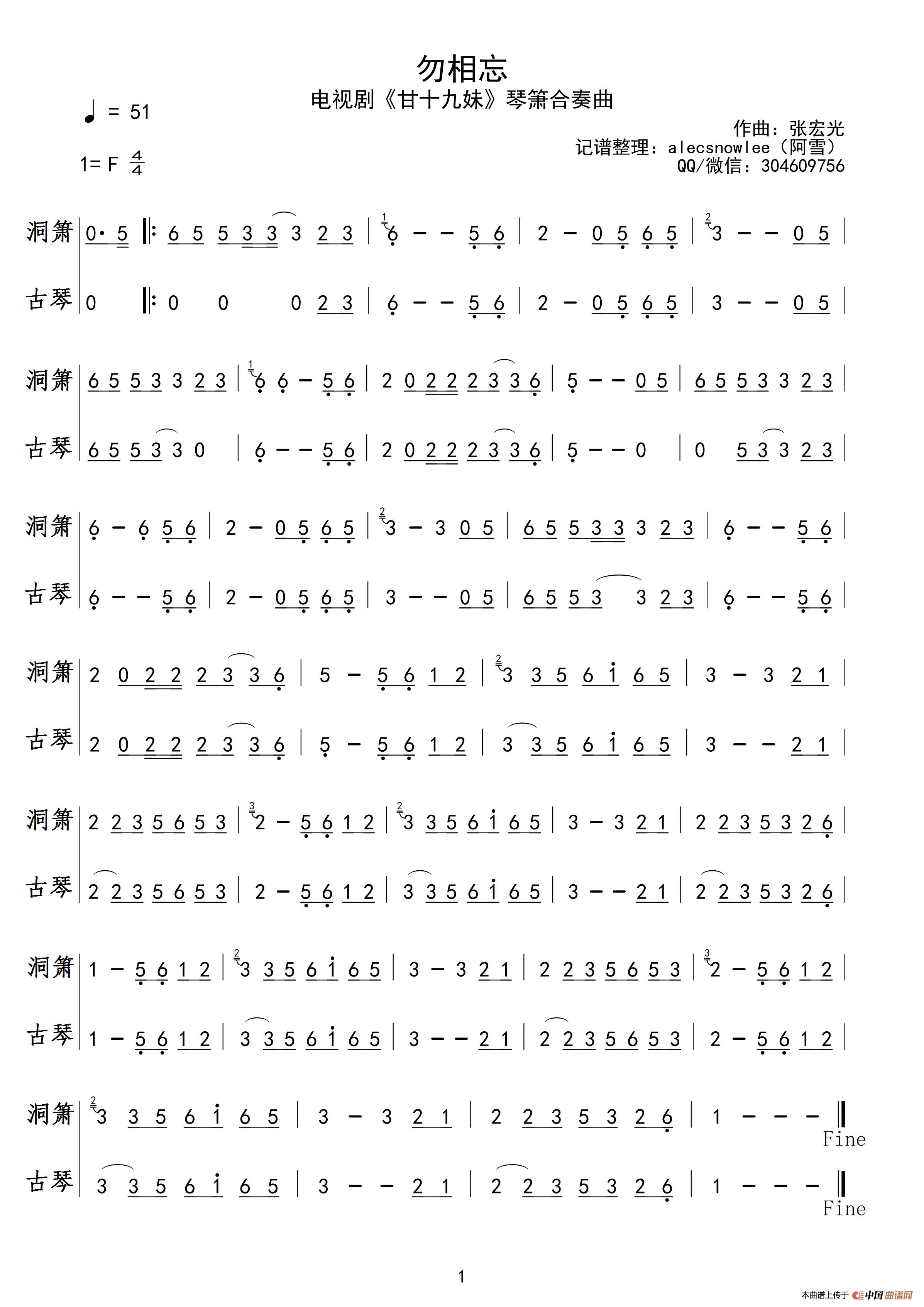 勿相忘(琴箫合奏简谱)(电视剧《甘十九妹》插曲)