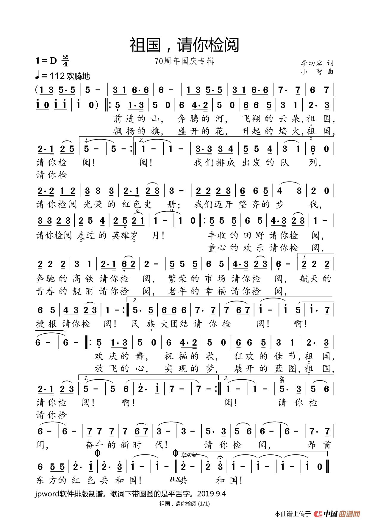 《祖国,请你检阅》歌词选自2019年7月号《词刊》。