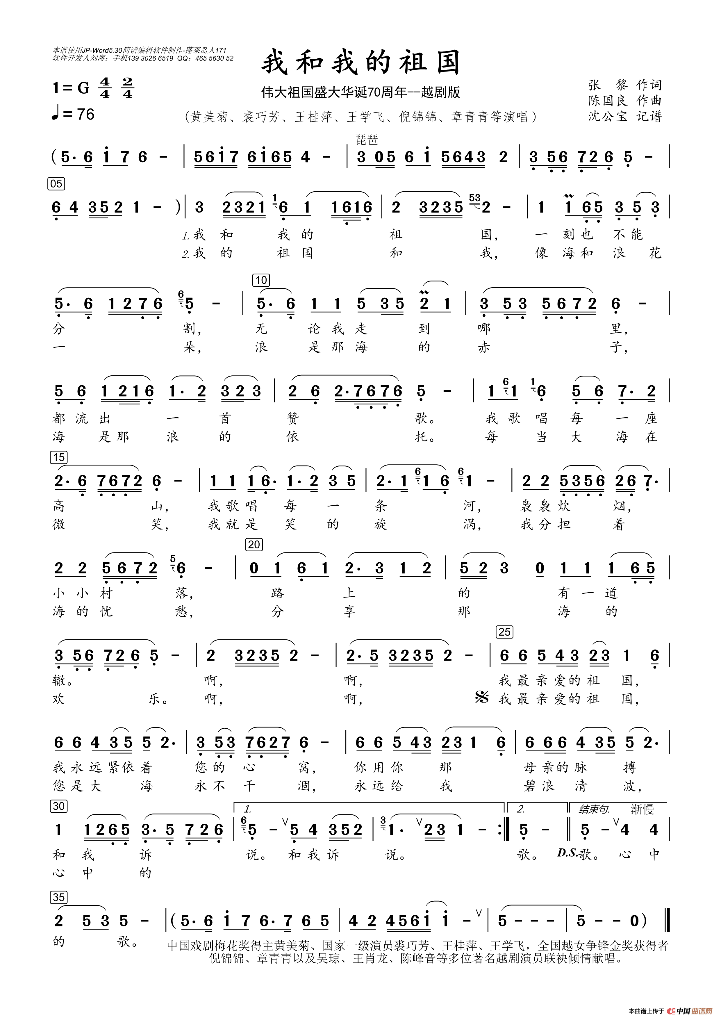 关于《我和我的祖国》曲谱的评论