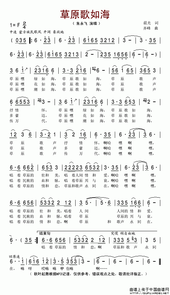 关于《草原歌如海》曲谱的评论